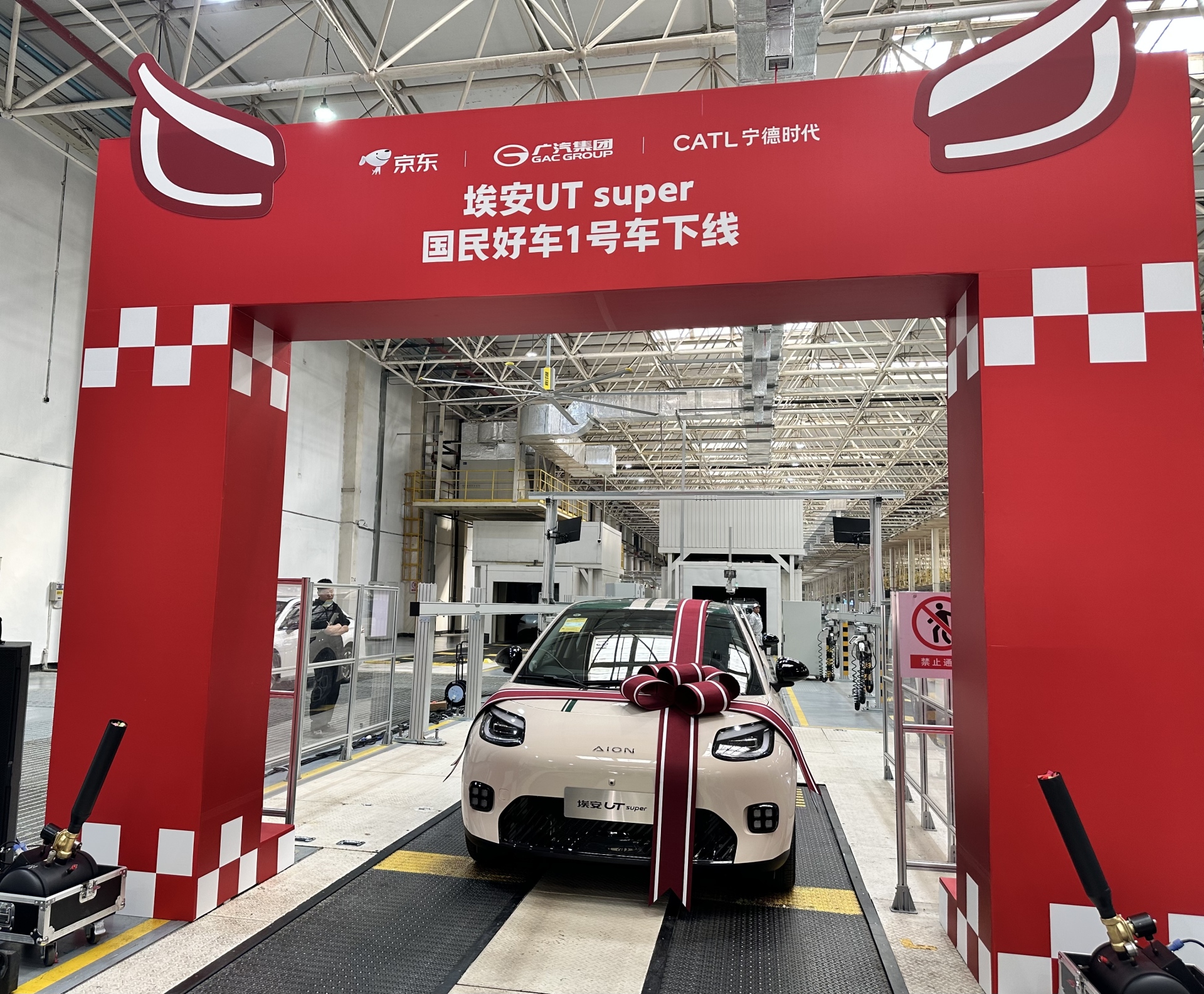 不过,最受关注的可能还是这款车的价格。工厂现场有工作人员向《每日经济新闻》记者透露,新车低于10万元的可能性很大。京东公布的调研数据也显示,83%的用户期待价格低于10万元。 记者注意到,该车为车电分离模式,后续则可通过京东平台租赁电池,具体买断、租赁电池的方式及价格会在11月9日正式发布时公布。现场工作人员称,月租版车型的价格很便宜。 该车换电在宁德时代的巧克力换电站进行,官方披露换电过程为99秒,记者现场体验时换电过程实际不到90秒。 作为该系列车型独家销售方,京东汽车营销负责人陆欢表示,未来会上线更多换电车型,用户在一个平台就能对比多款车型。 三方共创,“京东汽车”怎么卖? 随着1号车的下线,埃安UT super的预售、试驾也正式开启。记者注意到,京东App(应用程序)内的埃安汽车官方旗舰店上线了预售链接,用户支付500元意向金获取消费码后可到就近埃安门店试驾咨询。11月9日正式发布后,可在京东App订车以及选购配件、车载用品等套餐。 对于线上电商平台售车这一新模式,京东汽车营销负责人陆欢在接受记者现场采访时表示,线上售车首先能提升用户了解车辆信息的便捷性。“与单一平台相比,一是京东作为跨平台用户数据更丰富,能将用户搜索、点击等数据提供给合作伙伴,帮助调整产品;二是未来会上线更多换电车型,用户在一个平台就能对比多款车型,无需切换平台。” 记者注意到,10月底,京东汽车宣布启动“国民好车”交付中心全国招募计划,将联合全国范围内的优质4S店、汽车交付中心及综合服务中心,构建销售、交付、售后一体的服务网络。 对交付中心的要求,陆欢也进行了详细解释:一是需具备一定的面积和合适的位置;二是合作方需要有交付行业经验,京东会为交付中心提供产品与供应链资源,同时线上线下流量共享。“类似京东MALL模式,用户可线上线下灵活下单、交付。”他举例称。 换电如加油?C端换电市场正待铺开 从三方共创的这款埃安新车型来看,车电分离的尝试以及主打换电模式,一方面,通过电池租赁等方式,能够相对明显地降低用户首购成本;另一方面则是换电模式的补能效率相对充电更高。 记者了解到,这款埃安新车型整车质保由广汽负责,换电分买断版和租电版两种模式,广汽与京东都会做售后工作。其中,租电版电池由宁德时代(时代电服)提供终身质保且“只换不修”;买断版电池则由主机厂广汽负责三电质保,这是两者的核心区别。 值得一提的是,此次下线仪式的埃安UT super,是宁德时代巧克力换电首款私家车车型。