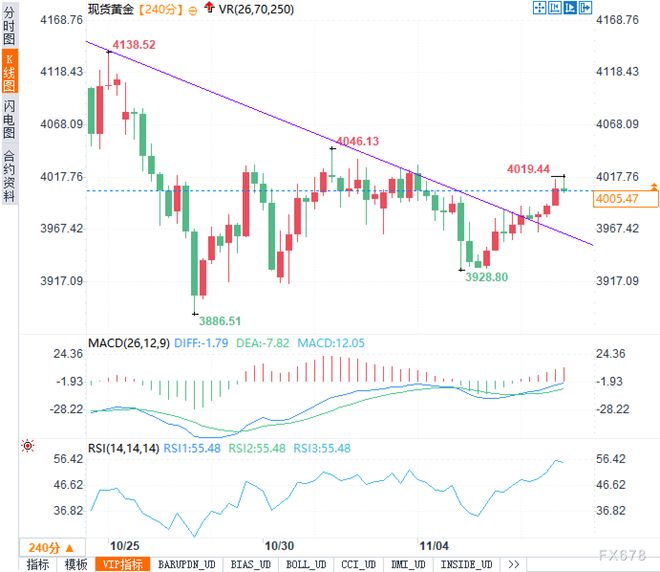 汇通财经讯——周四(11月6日),现货黄金北美时段于4000美元/盎司略微上方波动,四小时级别价格已重新靠近前期下行趋势线,短线反弹延续但尚未完成突破确认。 汇通财经APP讯——周四(11月6日),现货黄金北美时段于4000美元/盎司略微上方波动,四小时级别价格已重新靠近前期下行趋势线,短线反弹延续但尚未完成突破确认。