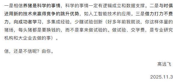 新猪派2025-11-06 09:40:46 18年间消失6000万养猪户,养得好就会做大,小有小的生存逻辑,扬翔股份高远飞谈中小规模猪企路在何方【鲁抗特约·数说猪业】 11月2-3日,2025生猪产业发展大会在广东省云浮市新兴县隆重召开。广西扬翔集团党委书记、副总裁高远飞参加了此次大会后,有感而发,即兴撰文,分享了一些对当前国内生猪产业发展趋势的思考,原文如下。