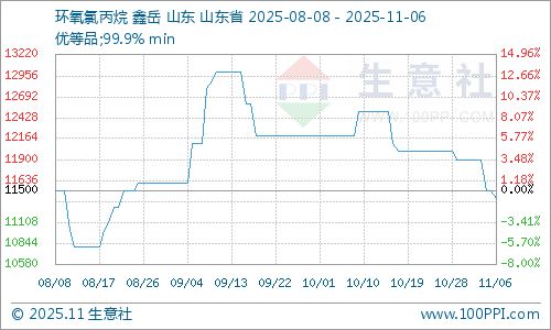 生意社11月06日讯 由于市场缺乏利好消息支撑,本周环氧氯丙烷市场交投重心下行。据生意社监测分析系统显示,截至11月6日,生意社环氧氯丙烷基准价为11400元/吨,与本月初相比,下降了-4.2%。