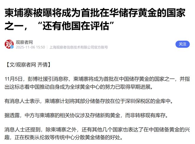 这两天有一条新闻,虽然是一件很不起眼的小事,但却非常值得我们关注。 在上个月的时候,柬埔寨国家银行行长曾表示,正在考虑“几个地点”存储国家黄金。 当时他们并没有明确透露消息,说是要在哪里存储。 不过现在,这条新闻有了后续。 11月5日,彭博社援引消息称,柬埔寨将成为首批在中国储存黄金的国家之一,并指出这标志着中国推动自身成为全球黄金中心的努力已取得早期进展。 有消息人士表示,柬埔寨计划将其部分储备存放在位于深圳保税区的金库中。 消息人士还提到,除柬埔寨之外,还有其他几个国家也表达了在中国储备黄金的兴趣,正在权衡从伦敦等传统中心分散黄金储备的好处。