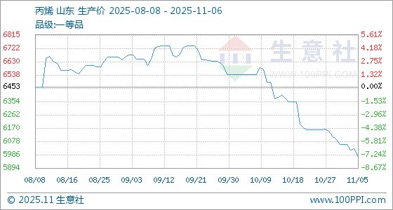 价格影响因素: 原料端:原料丙烯市场重心下行,对环氧丙烷市场支撑减弱。截至11月6日,生意社丙烯基准价为5970.75元/吨,与本月初(6058.25元/吨)相比,下降了1.44%。