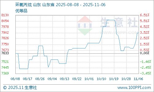 生意社11月06日讯 本周国内环氧丙烷市场价格有所上涨。据生意社监测系统显示,截止11月6日,生意社环氧丙烷基准价为7900元/吨,与11月1日相比,上涨了2.6%。