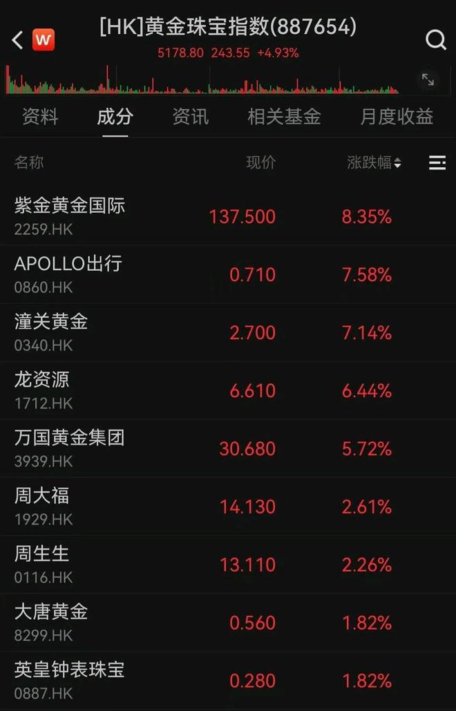 港股黄金股表现强势,截至发稿,紫金黄金国际大涨超8%,潼关黄金涨超7%,龙资源、周大福等纷纷上扬。