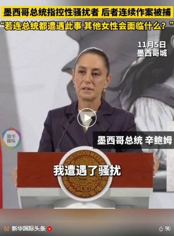 另据新华社,墨西哥总统辛鲍姆11月5日证实,自己前一天在首都墨西哥城街头遭一名醉汉猥亵,并已对该男子提出指控。她呼吁各州审查相关法律和程序,方便女性举报此类行为。 据路透社报道,辛鲍姆4日从墨西哥城国家宫步行前往附近的教育部,途中与民众打招呼。视频显示,一名中年男子将辛鲍姆搂住并上下其手,还试图亲吻她。辛鲍姆推开男子的手后,一名工作人员将两人隔开。该男子已于当晚被捕。