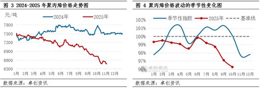 二、季节性规律失效:价格走势“跳出惯性” 市场价格变动核心由供需关系的动态博弈决定。通常而言,季节性旺季需求释放会推动价格上行,而淡季需求收缩则易导致价格回落。从下游消费特征来看,PP传统消费旺季集中在上半年3-4月与下半年9-10月,受旺季需求支撑,价格往往呈现环比上涨态势;与之相对,5月及下半年11-12月为传统消费淡季,需求转弱背景下价格多伴随环比下跌。这种“旺季涨价、淡季跌价”的需求与价格联动关系,共同勾勒出聚丙烯价格的“季节生物钟”,市场参与主体也长期依据这一规律安排生产、销售与采购节奏。 但近两年,价格波动开始明显背离季节性需求驱动的传统规律。以2025年为例,多个关键季节性节点接连“失准”:往年标志性的“金三银四”消费旺季,价格并未如预期出现上涨;传统“金九银十”行情中,需求带动的季节性涨价也未兑现。过去仅靠季节性规律即可预判的价格走势,在今年已完全不适用。在整体供需偏弱的大趋势下,除自身基本面因素外,宏观环境与成本端的变化对市场的影响力持续增强,进而导致市场投机需求结构改变。这种变化也警示市场参与者,单纯依赖季节性操作的逻辑已完全过时,需动态结合实时供需基本面、成本变动趋势及宏观环境变化,方能把握市场节奏。