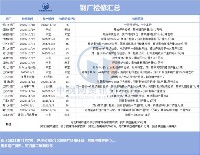 南京钢铁计划于11月上中旬对螺纹钢产线进行例行检修,为期20天,期间螺纹停产。 广东中南钢铁股份有限公司6号高炉计划从11月24日起休风检修38天,预计影响建材日均产量0.4万吨。 中天钢铁集团(南通)有限公司计划于11月20日对一台转炉进行例行检修,为期12天;计划于11月20日对1条螺纹钢产线进行例行检修,为期15天,预计影响产量待定。 福建三钢优特钢棒材生产线计划于2025年11月12日起停产检修13天,主要影响60-180mm中大规格,预计影响优特钢棒材总产量3万吨左右。 常州东方特钢计划于11月中下旬开始对一座550m³高炉进行检修,为期30天,预计影响铁水产量2000吨/天,同期对轧线轮流检修,影响轧圆总量7万吨。 现货稳中个调