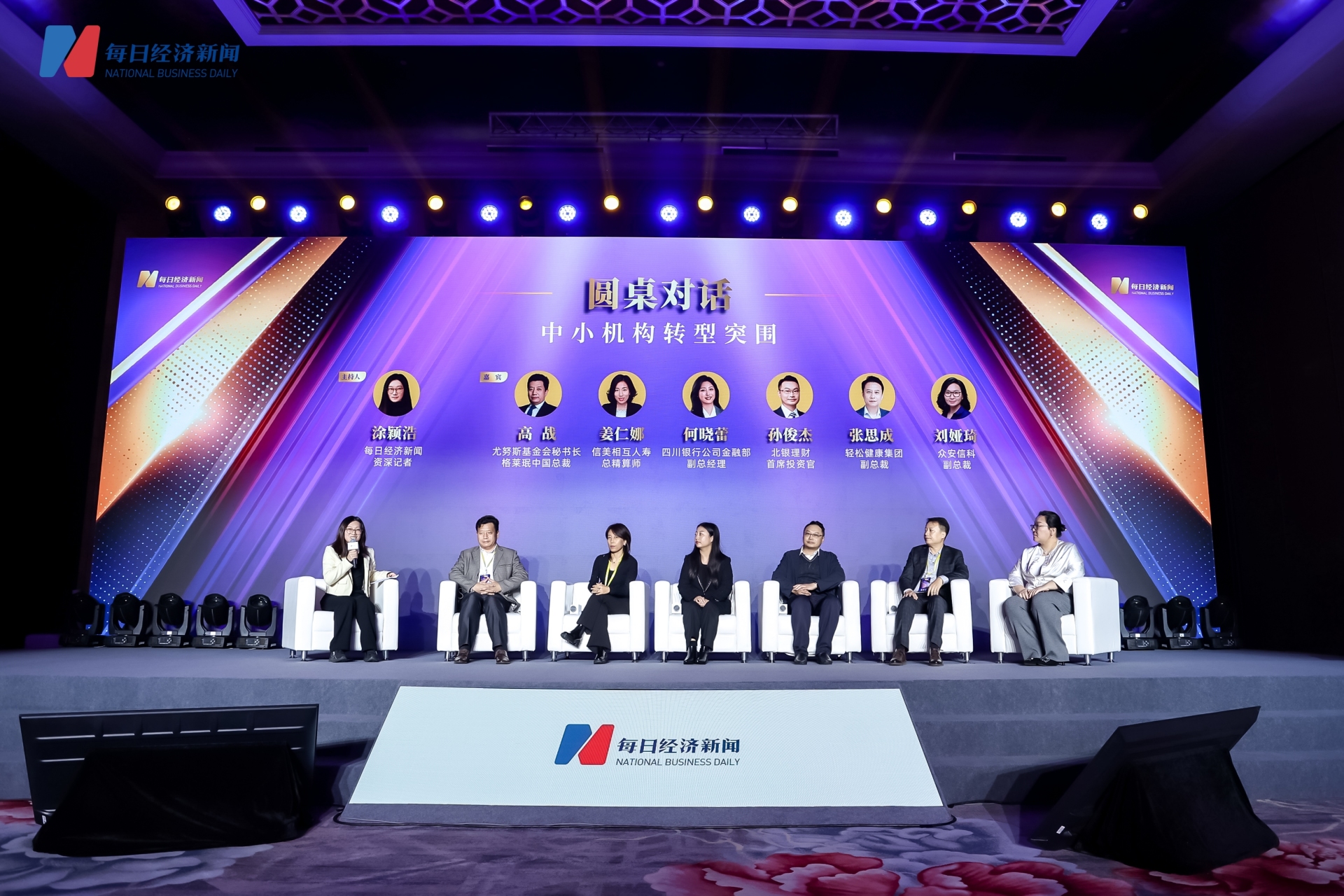 圆桌对话环节,尤努斯基金会秘书长、格莱珉中国总裁高战,信美相互人寿总精算师姜仁娜,四川银行公司金融部副总经理何晓蕾,北银理财首席投资官孙俊杰,轻松健康集团副总裁张思成,众安信科副总裁刘娅琦等围绕中小金融特色化经营、差异化发展路径等问题展开探讨。