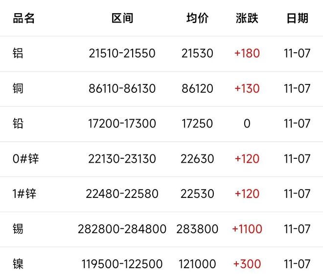7日有色宝长江A00铝21510~21550均价21530涨180,前三日均价21367,前五日均价21362