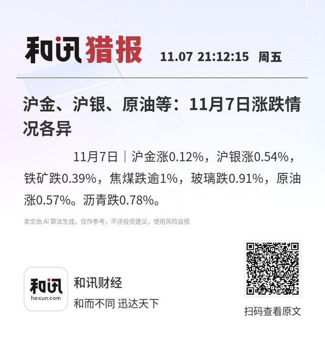 11月7日|沪金涨0.12%,沪银涨0.54%,铁矿跌0.39%,焦煤跌逾1%,玻璃跌0.91%,原油涨0.57%。沥青跌0.78%。