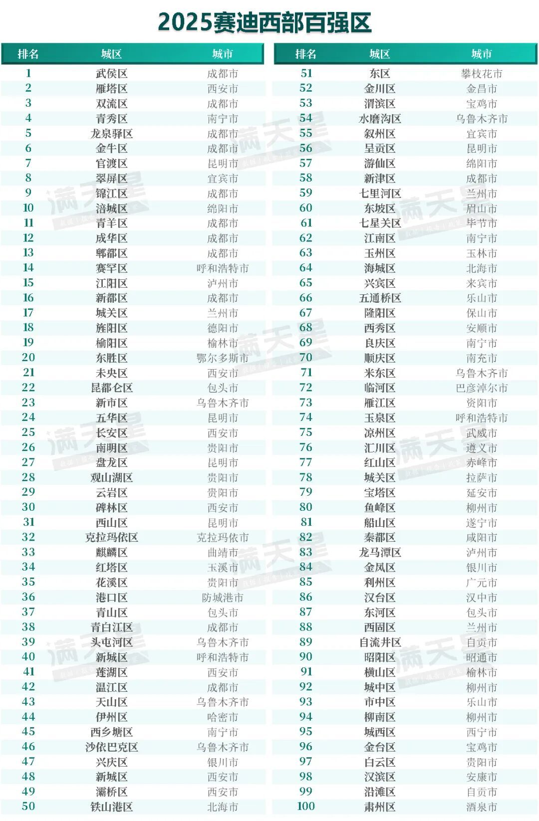 西部城区经济发展呈现出“核心引领、梯度分明”的显著特征。从数量分布来看,四川以绝对优势领先,共有29个城区入榜;从规模层级来看,区域内部发展不均衡,地区生产总值1000亿元以上的城区有32个,700亿-1000亿元的城区仅13个,400亿-700亿元的城区共51个,400亿元以下的城区只有4个。 |