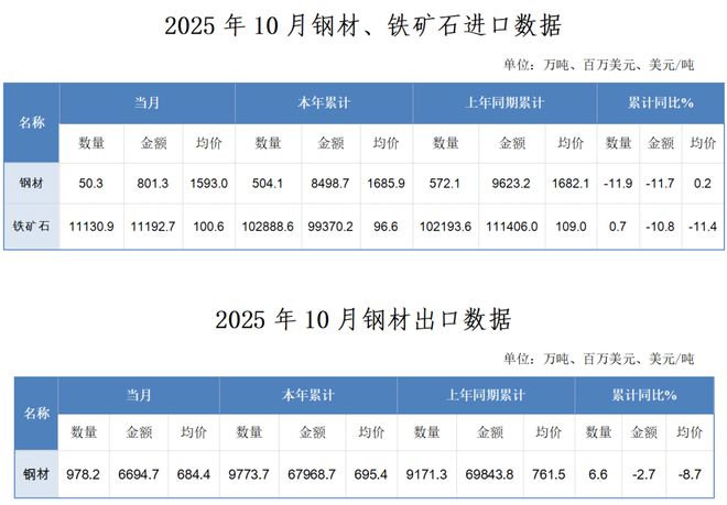 智通财经APP获悉,11月7日中国钢铁工业协会发文,根据海关统计快讯数据,2025年10月,