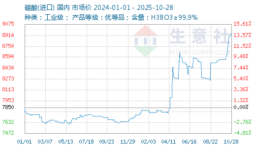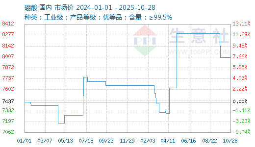 硼酸价格近期弱稳。据生意社商品行情分析系统显示,截止10月28日,国内硼酸市场均价8000元/吨。目前国产硼酸贸易商报价区间在7700-8200元/吨(不同品牌、不同规格、产品实际成交价以协商为主),主流价格据走货量在7800-8100元/吨。 海外进口货源方面,目前进口货源对外报价集中在8100-9400元/吨(不同品牌、不同规格、产品实际成交价以协商为主)。据生意社商品行情分析系统显示,进口硼酸市场均价8908.33元/吨,较10月初市场均价7624元/吨,上涨4.5%