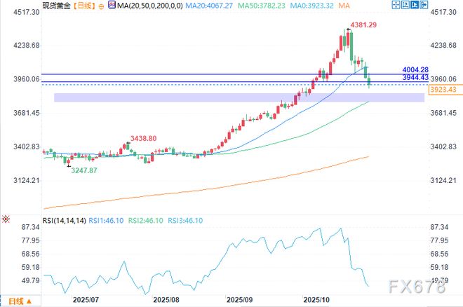 贸易乐观情绪与美联储前获利了结冲击黄金 抛售压力源于特朗普暗示可能与中国达成贸易协议,以及近期双边会谈取得进展。一系列与东南亚国家宣布的新贸易和关键矿产协议进一步提振风险情绪,推动亚洲股市走高,削弱避险需求。 ActivTrades的里卡多·埃万格利斯塔(Ricardo Evangelista)表示:“避免全面贸易战的希望……正推动股票等风险相关资产上涨。另一方面,这对黄金等避险资产的需求产生负面影响。” 此次下跌也发生在美联储周三政策决议前夕,市场普遍预期将降息。虽然低利率通常支撑黄金等无收益资产,但市场似乎在鲍威尔讲话前降低风险。交易员将密切关注任何前瞻性指引,这些指引可能会重新调整对美联储年底前政策路径的预期。 技术面破位暴露更深支撑位 从技术面看,黄金在跌破4100.43美元枢纽位并失守4004.28美元和3944.43美元的摆动低点后,进入看跌区域。这为测试3846.50美元水平(最近一轮涨势的关键50%回撤位)扫清了道路,其下方就是3782.23美元的50日均线。该区域可能吸引逢低买入者并引发部分空头回补,但除非多头能守住该区域并收复3944.43美元水平,否则整体偏向仍偏向下行。 长期前景仍在,但短期回调已现 尽管本周出现回调,但在各国央行买入、地缘政治不确定性以及对法定货币信心下降的支撑下,黄金的整体趋势仍看涨。 现货金价在10月20日触及4381.44美元的历史高点后,今年以来仍上涨超50%。 然而,短期动能明显停滞。花旗近期将其0-3个月黄金价格预期下调至3800美元,而资本经济公司则认为到2026年底金价将跌至3500美元——这表明在长期看涨格局重新确立之前,金价仍有进一步下行空间。 金价预测:除非多头守住3782.23美元,否则卖方掌控局面