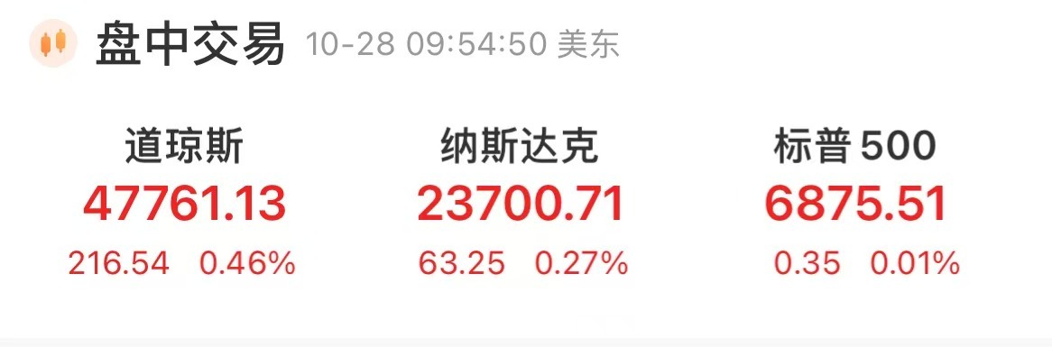 每经编辑|黄胜 北京时间10月28日晚,美股三大指数小幅高开,道琼斯指数涨0.65%,标普500指数涨0.31%,纳斯达克综合指数涨0.54%,均刷新历史新高。 截至发稿,道琼斯指数涨0.46%,标普500指数涨0.01%,纳斯达克综合指数涨0.27%。