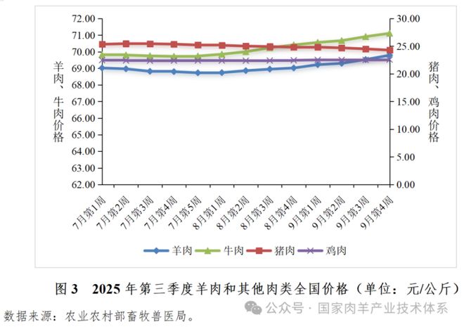 猪肉连跌,牛羊肉坚挺 在猪肉价格连跌不休,最近才刚稍许有起色的同时,牛羊肉却坚挺得很!同样是红肉,为什么猪肉能便宜到这个份上,难道杂食的猪吃的饲料比草还便宜? 比如,10月24日全国批发市场牛肉66.61元/公斤,羊肉61.98元/公斤,买4斤猪肉的钱才能买一斤牛肉,买3斤半猪肉的钱够买一斤羊肉! 更专业统计数据,同样支持“牛羊肉坚挺”的观点:第三季度,羊肉、猪肉、牛肉和鸡肉价格呈现出明显的分化走势。从价格水平看,羊肉和牛肉价格走势相近,均呈现先降后升的波动上行趋势,而猪肉和鸡肉价格则表现相对疲软。 具体来看,羊肉价格从7月初的69.02元/公斤波动回升至9月底的69.79元/公斤,整体上升1.12%;牛肉价格从69.82元/公斤稳步上升至71.11元/公斤,涨幅达1.85%;猪肉价格从25.35元/公斤下降至24.29元/公斤,跌幅为4.18%;鸡肉价格从22.47元/公斤微幅上升至22.58元/公斤,涨幅仅0.49%。