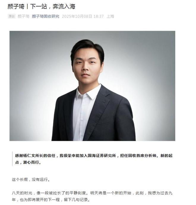在最后《债市性价比如何?》的研报中,靳毅表示从利率体系比价和多资产比价维度看,债券市场估值已经修复至近两年的合理水平,正在向近五年中性水平靠近,具备一定配置性价比。不过,受到股市上涨、风险偏好回升影响,短期债市或仍面临扰动,做多机会仍需等待。 目前,靳毅国海固定收益首席分析师的位置由华安证券原固收分析师颜子琦替代。 国庆节假期最后一天,华安证券固收分析师颜子琦在个人公众号官宣加入国海证券研究所,出任固收首席分析师。中证协信息显示,颜子琦执业机构于9月1日从华安证券注销,9月22日变更为国海证券。 颜子琦在最新研报《重启国债买卖影响几何》中提到,在买入期限上,可能将延续“买短”,同时“卖长”的必要性降低。今年6月以来大行开始买入短债,10月末央行宣布重启国债买卖,两者行为有一定先后关联性,后续可高频跟踪大行的买债行为,以此判断央行的操作动向。不过,对债市整体而言,此次恢复国债买卖虽然短期提振了情绪,但其信号意义可能大于实质影响。中长期趋势仍需等待基金赎回费率改革等关键政策的实质性落地,以及降准降息带来的利率中枢整体下移。此外,央行在操作过程中或仍会关注市场利率下行节奏,若重现过快下行局面,其操作力度和节奏可能随之调整。