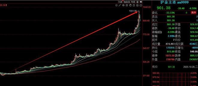 9月黄金涨幅创14年来最大单月涨幅 值得注意的是,自8月份底以来国际黄金价格加速上涨,其中伦敦现货黄金价格9月单月大涨12%,并在节后一度冲至4381.11美元/盎司的历史高点,纽交所黄金期货主力合约9月累计上涨10.16%,创2011年8月以来最大单月涨幅。10月20日,纽交所黄金期货主力合约一度冲至4398美元/盎司的历史高点,自8月26日以来,在短短40个交易日大涨超过28% 受国际黄金价格大涨影响,上期所交易的沪金主力合约也迎来加速暴涨。从8月26日到10月17日,沪金主力合约大涨28.31%,并在10月17日当天,一度打破1000元/克的大关,最高触及1001.96元/克。若拉长时间线,自2022年7月21日369.82元/克低点以来,最高上涨632.14元/克,最高涨幅达到170.93%。