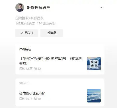不过靳毅确实目前已从国海证券离职。中国证券业协会从业人员名单中已经查询不到国海证券靳毅的从业信息。此前一直更新的国海固收团队研报的靳毅个人公众号“靳毅投资思考”,目前一直停留在9月9日的《债市性价比如何?》。当时有消息称靳毅已经从国海证券离任,具体下一站暂时未知。 据“国海证券研究”文章提到,靳毅曾任国海证券研究所所长助理、固定收益首席分析师,有12年债券市场研究、投资、交易经验。他是北京大学理学硕士、经济双学士,曾任申万宏源证券资产管理事业部产品总监、投资经理,曾累计参与管理债券规模超1000亿元;2023年水晶球总榜单债券行业第2名。