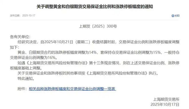 而期货可以杠杆交易极大的放大收益,此前上期所黄金、白银期货合约套保持仓交易保证金比例调整为13%,一般持仓交易保证金比例调整为14%。如作为一般持仓交易的个人,其投资杠杆最高可以放大到超过7倍。 此外期货交易中独有的可浮盈加仓机制,还能够进一步放大收益。有业内人士分析表示,上述传闻中描述的黄金期货投资收益,虽然通过浮盈加仓策略有可能实现,但也需要承担很高的风险,属于投资中的小概率情形。 上期所已经出手调控 不过黄金连续大涨之后,上期所已经出手调控。 10月17日,上期所发布通知称,近期国际形势复杂多变,贵金属市场波动较大,请各有关单位采取相应措施,提示投资者做好风险防范工作,理性投资,共同维护市场平稳运行。经研究决定,自2025年10月21日(星期二)收盘结算时起,调整交易保证金比例和涨跌停板幅度。根据通知,黄金、白银期货合约的涨跌停板幅度调整为14%,套保持仓交易保证金比例调整为15%,一般持仓交易保证金比例调整为16%。