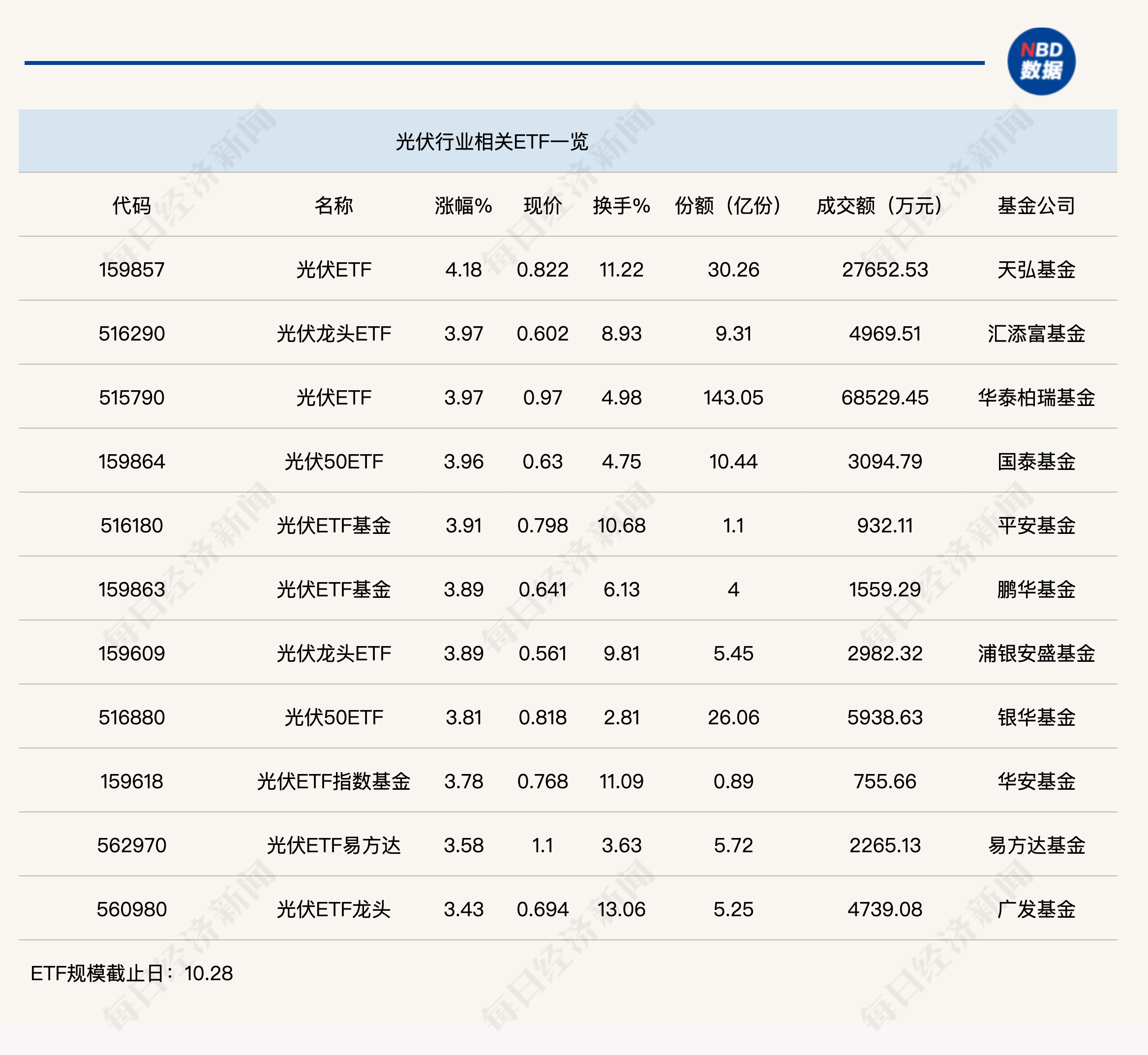从投资逻辑来看,此前硅料硅片环节价格已经大幅回暖,硅料龙头企业单季度利润转正,行业盈利能力有所修复,现组件环节价格亦有所上涨,盈利修复可期。在政策持续加码的背景下,行业已形成供给侧改革合力,景气度有望持续改善。 点评:光伏ETF(159857)今日上午大涨4.18%,规模30.26亿份,半日成交金额为2.77亿元。该ETF追踪的是中证光伏产业指数,追踪该指数的ETF还包括光伏龙头ETF(516290)、光伏ETF(515790)等。其中,光伏ETF(515790)规模最大,达到143.05亿份,半日涨幅为3.97%,成交金额达到6.85亿元。 具体来看,华泰柏瑞中证光伏产业ETF(515790)为光伏产业规模最大的ETF。该产品基金管理人是国内最早推出ETF产品的中外合资基金管理公司之一。目前,华泰柏瑞基金已发展成为产品种类丰富、经营业绩优秀、业务领域全面的基金管理公司之一。 中证光伏产业指数(931151.CSI)发布于2019年4月22日,从沪深市场主营业务涉及光伏产业链上、中、下游的上市公司证券中,选取不超过50只最具代表性的上市公司证券作为指数样本,以反映沪深市场光伏产业上市公司证券的整体表现。