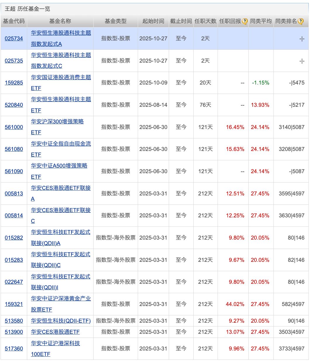 2、ETF主题机会 此前硅料硅片环节价格已经大幅回暖,硅料龙头企业单季度利润转正,行业盈利能力有所修复,现组件环节价格亦有所上涨,盈利修复可期。在政策持续加码的背景下,行业已形成供给侧改革合力,景气度有望持续改善。可关注光伏ETF等产品。 四、明日重点关注新发基金1、基金简称:华安恒生港股通科技主题指数发起式 基金类型:股票型、发起式证券投资基金 基金经理:王超 业绩比较基准:恒生港股通科技主题指数收益率(经汇率调整)×95%+商业银行税后活期存款利率×5% 基金经理过往业绩: