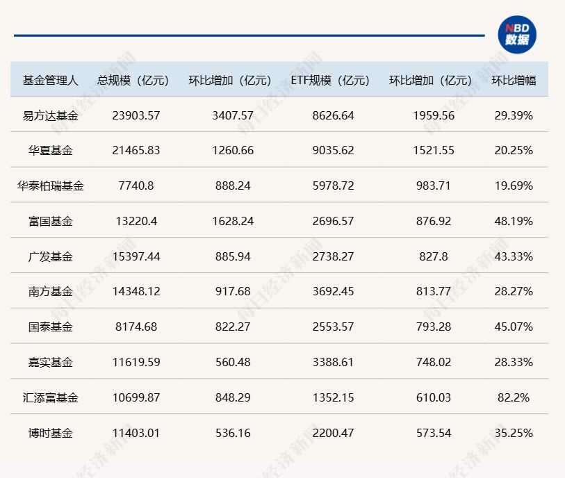非货基前三强依然是易方达基金、华夏基金和广发基金,最新规模分别为1.67万亿元、1.42万亿元和9213.62亿元,相比二季度末分别增长了2586.05亿元、1718.87亿元和850.87亿元,依然保持了稳定的增长速度。 富国基金相比二季度末也增长超过千亿元,排名升至第四位;南方基金、华泰柏瑞基金也均上升一位,目前分别排在第五和第七名;景顺长城基金新进非货基前十的行列。同时,嘉实基金由二季度末的第四名来到第六名,博时基金也下滑一位到第八名,招商基金则从第十位降至第十一位。 指数基金成增长“利器” 易方达、华夏ETF规模单季度增长超千亿元从各家基金管理人的规模增长情况来看,指数基金俨然成为增长“利器”,其中ETF的增长速度已经成为决定基金公司规模座次的一项重要因素。 举个例子,三季度有两家公司ETF规模增长超过1000亿元,分别是易方达基金和华夏基金,前者环比增加已经接近2000亿元。 而在三季度,这两家公司的总规模分别增加了3407.57亿元和1260.66亿元,可以看出ETF为公司规模增长立下了“汗马功劳”。 除此之外,综观ETF规模增长前十位的公司,可以发现除了极个别管理人,其他公司规模增长都是主要倚仗ETF的增量。“得ETF者得天下”,这些数据也很好地体现了ETF业务对于基金公司的重要性。