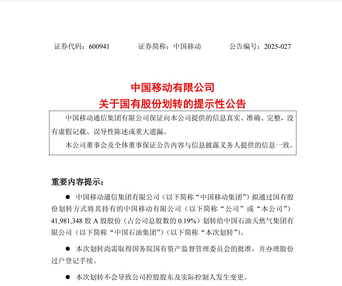 每经编辑|杜宇 11月3日晚间,中国移动(SH600941)发布公告称,中国移动通信集团有限公司(以下简称“中国移动集团”)拟通过国有股份划转方式将其持有的中国移动4198.13万股A股股份(占公司总股数的0.19%)划转给中国石油天然气集团有限公司(以下简称“中国石油集团”)。