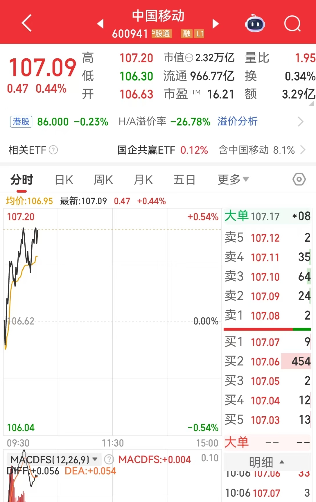 截至11月4日发稿,中国移动报107.09元,涨幅0.44%。市值2.32万亿元。