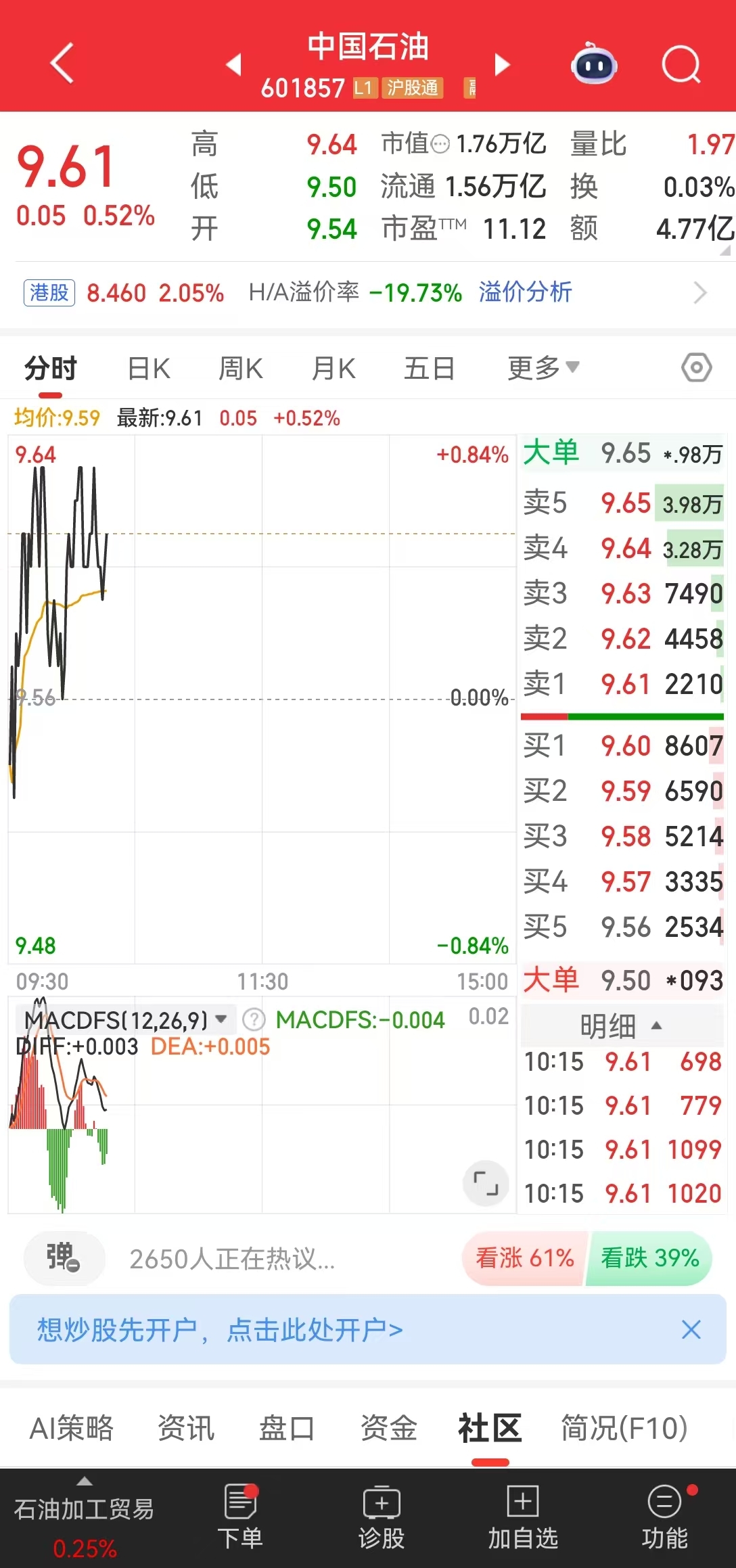 中国石油报9.61元,涨幅0.52%,市值1.76万亿元。
