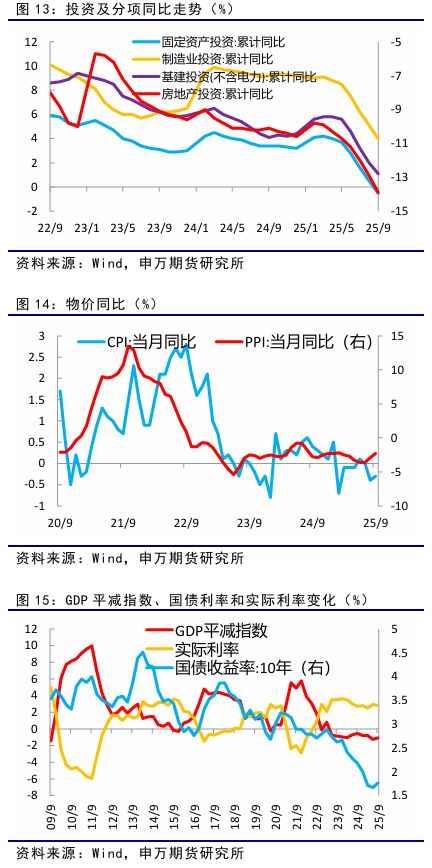 前三季度全国固定资产投资(不含农户)同比下降0.5%,主要受房地产开发投资下滑影响。若扣除房地产开发投资,全国固定资产投资实际增长3.0%。其中,制造业投资同比增长4.0%,基础设施投资同比增长1.1%。 9月CPI、PPI数据显示,物价整体呈温和回升态势。CPI环比上涨0.1%,同比下降0.3%,降幅收窄,核心CPI同比上涨1.0%,涨幅连续第5个月扩大。食品价格环比上涨0.7%,但猪肉等价格下降,能源价格也下降。PPI环比持平,同比下降2.3%,降幅收窄,煤炭加工等部分行业价格企稳,石油相关行业价格受国际油价影响下降。 三季度GDP同比增长4.8%,较上半年有所回落。前三季度GDP总量达1015036亿元,按不变价格计算,同比增长5.2%。三季度GDP平减指数为-1.07%,降幅有所收窄,实体经济承担的利率小幅下降。