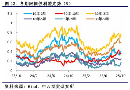 二、11月份行情总结展望 1、政策助力期债价格回升 10月份以来,国债期货价格走势偏强,一改三季度的弱势走势,主要是央行加大公开市场操作力度,恢复国债买卖操作,市场资金面转松,加上海外美国政府停摆,美联储降息和中美贸易摩擦等因素影响。 展望后市,尽管中美经贸磋商达成共识,但外部环境复杂严峻,不确定性仍存在,美联储进入降息周期后,美债收益率总体回落,国内货币政策空间加大。国内工业生产保持高位,以房地产为代表的需求端仍疲软,物价处于低位,二十届四中全会提出了“十五五”时期经济社会发展的主要目标,预计央行降准降息仍有空间,且将加大国债买卖等操作,资金面保持合理充裕,为“十五五”经济稳定增长和金融市场稳定运行营造适宜的货币金融环境,对国债期货价格也具有一定的支撑。 2、期现套利机会不明显 近期,国债期货价格和各主力合约对应的IRR有所回升,期货价格强于现货价格,但总体保持在1.8%附近,期现套利机会不明显。 3、关注跨期价差变化 国债期货的交割月份一般是 3、6、9、12四个季月。国债期货的跨期价差就是指的主力合约与它下一个季月的国债期货合约价格之差。11月份,2512合约将逐步开始移仓至2603合约,关注11月份移仓期间的跨期价差变化情况。 4、关注跨品种利差走势 10月份,长端利率下行幅度大于长端,长短端利差有所扩大,关注跨品种利差走势。