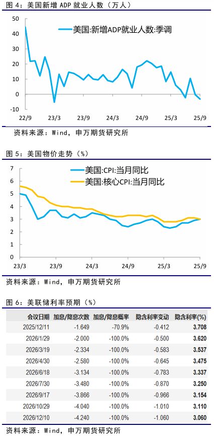 美国9月ADP就业人数减少3.2万人,低于预期和前值,政府停摆导致非农等多项经济数据未能按时公布,加上疲软的就业数据,推动避险需求上升。 9月美国消费者价格指数(CPI)环比上涨0.3%,低于8月的0.4%;同比上涨3.0%,略高于前值的2.9%,但仍低于市场预期的3.1%。剔除食品与能源后的核心CPI环比上涨0.2%,连续第三个月回落,同比涨幅亦降至3.0%。通胀涨幅温和为美联储再次降息25个基点打开了空间。 10月29日,美联储如期降息25个基点,为年内第二次降息,并宣布自12月1日起结束资产负债表缩减,但美联储主席鲍威尔表示,12月是否进一步降息“远非已成定局”,政府停摆导致数据缺失,可能影响后续决策,受此鹰派讲话影响,12月降息的概率下降。