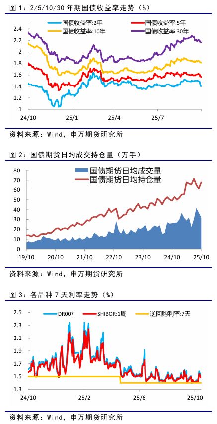2、行情图解 10月份以来,国债期货价格走势偏强,一改三季度的弱势走势,10年期国债期货主力合约T2512上涨超过0.6%,10年期国债收益率下行超过4bp,短端2年期国债收益率下行超过9bp。主要是央行加大公开市场操作力度,恢复国债买卖操作,市场资金面转松,加上海外美国政府停摆,美联储降息和中美贸易摩擦等因素影响。 10月份,国债期货日均成交量为31.81万手,环比减少13.76%,主要受国庆长假影响,日均持仓量67.80万手,环比增加10.49%,市场套保需求仍大,持仓量继续回升。预计国债期货套保需求继续保持旺盛,成交持仓有望继续维持高位。 从资金面来看,本月央行公开市场小幅净投放,连续第八个月加量续做MLF。月初DR007和SHIBOR:1周回落到1.4%下方,不过临近月底,市场资金利率有所回升,总体保持相对稳定。