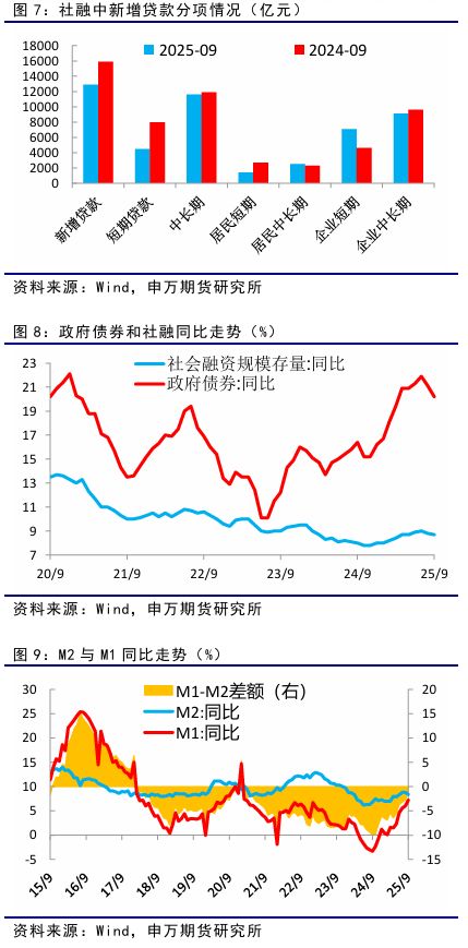 9月份居民贷款较8月份显著增加,居民消费贷等短期贷款和购房等中长期贷款环比均有所恢复,但仍低于去年同期。 9月份,非金融性公司及其他部门贷款新增12200亿元,同比少增2700亿元,票据融资减少,企业短期贷款显著增加,中长期贷款维持高位,企业融资结构进一步优化。 1-9月份政府债券合计净融资11.46万亿元,同比多增4.28万亿元,显著高于去年同期,带动当月社会融资规模超过3.5万亿元,保持社融存量增速维持在8.7%,环比上月小幅回落0.1%,但继续显著高于GDP增速,托底经济作用显著。 9月份,居民和企业存款同比多增,非银存款增长态势未延续,财政存款少增,新增人民币存款同比少增,M2增速小幅回落至8.4%。M1同比增速回升7.2%,创2021年3月份以来的新高,M2与M1增速差由去年9月的10.1%高点降至1.2%,货币结构正在活化,预示着企业信心的回升,市场经济活动趋于活跃,经济活力逐步提升。