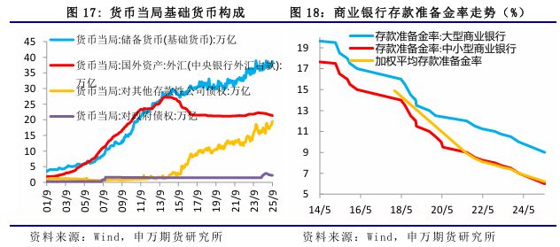 4、热点问题 央行恢复国债买卖操作 10月27日,在2025金融街论坛年会开幕式上,人民银行行长表示:今年初,考虑到债券市场供求不平衡压力较大、市场风险有所累积,人民银行暂停了国债买卖。目前,债市整体运行良好,人民银行将恢复公开市场国债买卖操作。 公开市场国债买卖操作是指央行在二级金融市场上买入或卖出国债,以此来调节市场流动性和引导利率的一项常规流动性管理工具,是货币政策工具,不是为了财政赤字融资。主要目的是为调节市场流动性,引导和稳定市场利率,完善国债收益率曲线。 2024年8月,央行正式在公开市场开展国债买卖操作,当月净买入债券面值为1000亿元,随后9-11月,央行净买入债券2000亿元,12月净买入3000亿元,加大货币政策逆周期调节力度。不过由于当时政府债券市场持续供不应求,央行决定自2025年1月起暂停开展公开市场国债买入操作。 央行此次恢复公开市场国债买卖操作,首先,对于债券市场来说,央行作为“超级买家”入场,直接增加了国债的市场需求,稳定债市预期,从债券现货市场来看,10年期国债活跃券收益率下行达到5bp。 其次,对于市场流动性来说,央行在二级市场买入国债,相当于直接向银行体系投放基础货币,这种投放属于中长期流动性,效果比短期的逆回购操作更持久,有助于降低实体经济的综合融资成本。2014年以前,贸易顺差导致外汇占款大幅增长央行被动投放基础货币,2014 年之后外汇占款下降,2016年之后趋于稳定,由PSL/MLF等工具替代,主动投放基础货币,未来国债买卖操作有望成为新的基础货币投放工具。 再次,该操作是货币政策和财政政策协同配合的重要纽带,如果短期政府债券发行量较大,央行可以通过购债操作平滑政府债券发行对市场的冲击,保障宽财政政策顺利实施。 此外,央行行长还表示,将继续坚持支持性的货币政策立场,实施好适度宽松的货币政策,综合运用多种货币政策工具,提供短期、中期、长期流动性安排,保持社会融资条件相对宽松。