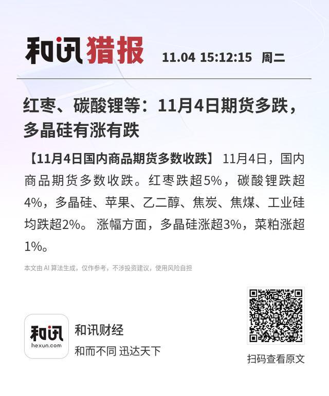 【11月4日国内商品期货多数收跌】11月4日,国内商品期货多数收跌。红枣跌超5%,碳酸锂跌超4%,多晶硅、苹果、乙二醇、焦炭、焦煤、工业硅均跌超2%。 涨幅方面,多晶硅涨超3%,菜粕涨超1%。