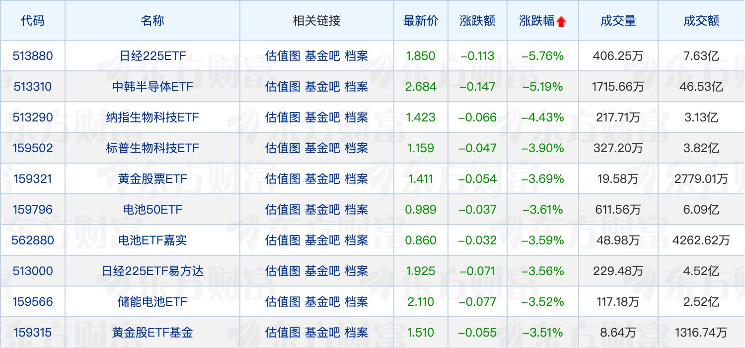 下跌方面,日经225ETF、中韩半导体ETF跌幅超过5%,纳指生物科技ETF也进入跌幅榜前列。