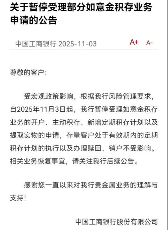 政策生效后的前两天,市场的反应还相对平稳,但到了11月3日,明显的波动开始出现。 多家银行率先做出调整,工商银行、建设银行相继宣布暂停部分黄金积存业务,包括新开账户、主动积存和提取实物等业务都暂时无法办理。 虽然银行客服解释这是出于风险管理的考虑,存量客户的赎回和销户不受影响,而且当晚工商银行就恢复了相关业务,但短暂的暂停还是给市场带来了不小的情绪影响。