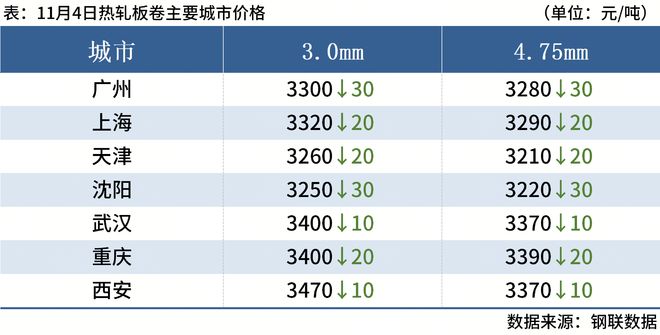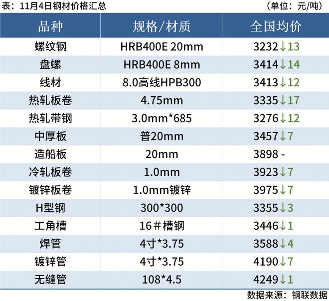 一、钢材现货和期货价格汇总 11月4日,国内钢材市场价格延续跌势,唐山迁安松汀钢铁普方坯资源下调10,执行2950含税出厂。黑色期货全线下跌,商家降价促销,但成交量继续萎缩。