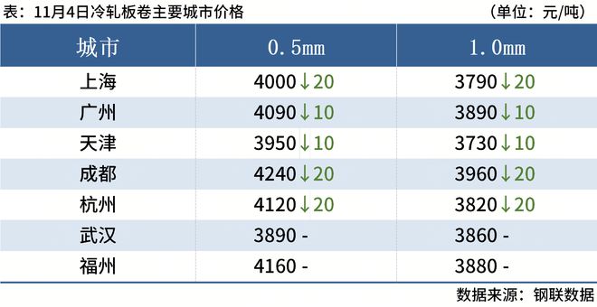 冷轧板卷:11月4日,全国24个主要城市1.0mm冷卷均价3923元/吨,较上一交易日下跌7元/吨。早间开市多数市场报价暂持稳观望,然盘中热卷期货持续下行,市场交易活跃度偏淡,整体心态偏悲观,对于当前相对高供应及终端同比偏弱需求,商户谨慎度有增无减,加大出货力度同时订货更趋谨慎。虽然目前主流市场冷热价差维持在500元/吨左右,但市场库存年同比处于高位,去库缓慢,整体压力依旧存在。综合来看,预计5日全国冷轧板卷价格延续弱势调整运行。