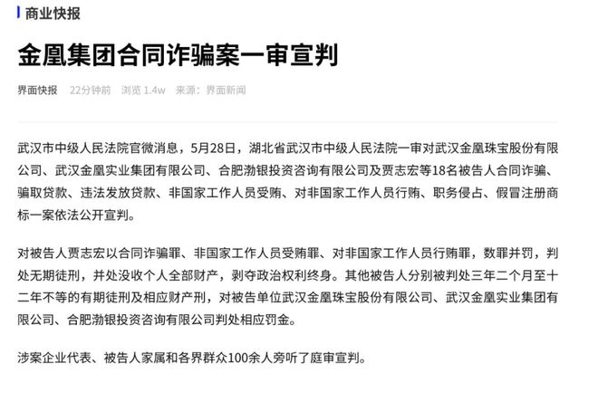 在这些受害机构中,民生信托和恒丰银行受到的影响最为深远。 民生信托因36个多亿的损失,导致其母公司泛海控股的资金链断裂,最终陷入破产重整的境地; 恒丰银行则因27亿损失,被监管部门责令整改,多名高管被问责,还引入了战略投资者才得以“续命”; 东莞信托虽然是首个发现造假的机构,但28亿元的损失也让其净利润连续三年为负。 六、罪与罚 2024年5月28日,武汉市中级人民法院对金凰假黄金案进行了公开宣判。 庭经审理查明,贾志宏伙同他人,以非法占有为目的,虚构事实、隐瞒真相,采用“金包铜”假黄金质押的方式,与15家金融机构签订借款合同、信托合同等,骗取资金253.45亿元,造成实际损失141.48亿元,其行为已构成合同诈骗罪;同时,贾志宏还通过行贿等方式,骗取银行贷款,构成骗取贷款罪;此外,他还存在职务侵占、非国家工作人员受贿等多项犯罪事实。 最终,法院作出一审判决:贾志宏犯合同诈骗罪、骗取贷款罪、职务侵占罪、非国家工作人员受贿罪,数罪并罚,判处无期徒刑,剥夺政治权利终身,没收个人全部财产;同案的17名被告人(含邹大春、张某等)分别被判处有期徒刑三年二个月至十二年不等,并处罚金;对被告单位武汉金凰珠宝股份有限公司、武汉金凰实业集团有限公司、合肥渤银投资咨询有限公司判处相应罚被判处罚金共计5亿元。 在庭审现场,贾志宏进行了最后陈述。他表示,自己对所犯罪行深感悔恨,对不起受害的金融机构,对不起公司的员工和股东,也对不起自己的家人。但他同时辩称,自己的初衷是为了挽救企业,只是“走了歪路”。法院认为,贾志宏的诈骗数额特别巨大,情节特别严重,给金融机构造成了重大损失,社会危害性极大,即使有悔罪表现,也不足以从轻处罚。