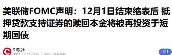 42 面对系统性风险,政策转向势在必行。美联储随即宣布,自12月1日起,将对到期国债本金进行再投资,这意味着资产负债表收缩正式结束,“印钞机”即将重启。新一轮基础货币投放已在路上,也预示着美元长期贬值路径基本确立。 43