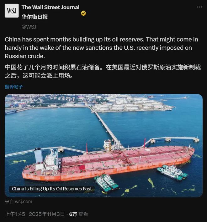 中国是全球最大石油进口国,能源安全自然是重中之重。业内推测,中国目前的石油库存可满足约110天消费,预计到2026年可能增至140至180天。这一数字远超过国际能源署建议的90天标准。 地缘政治风险是另一个关键考量。在美国频繁运用制裁手段的背景下,中国约20%的进口石油来自伊朗、俄罗斯和委内瑞拉等受制裁国。增强储备成为保障能源安全的现实需要。 最近的地缘政治事件印证了这一担忧。美国宣布对俄罗斯两大石油公司,俄罗斯石油公司和卢克石油公司实施制裁,导致中国多家国有石油公司暂停购买俄罗斯石油。这种事态发展表明,能源供应确实面临潜在风险。