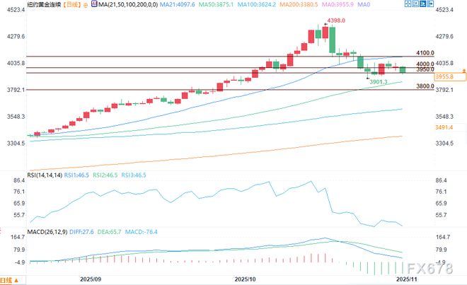 汇通财经讯——从技术面来看,12月黄金期货多头的下一个上行目标是推动收盘价突破4100.00美元的关键阻力位。空头的下一个短期下行目标是将期货价格压至3800.00美元的关键技术支撑位下方。 汇通财经APP讯——周二(11月4日)美国早间交易时段,黄金和白银价格走弱。同时,全球股市却处于下跌状态。若美国股指在当日交易时段遭遇强劲抛售压力,市场避险情绪升温推动黄金和白银价格反弹,这一情况并不意外。12月交割的黄金期货(通常高于现货金十几美元)价格盘中下跌55.9美元,报3958美元;12月交割的白银期货价格盘中下跌1.104美元,报46.945美元。