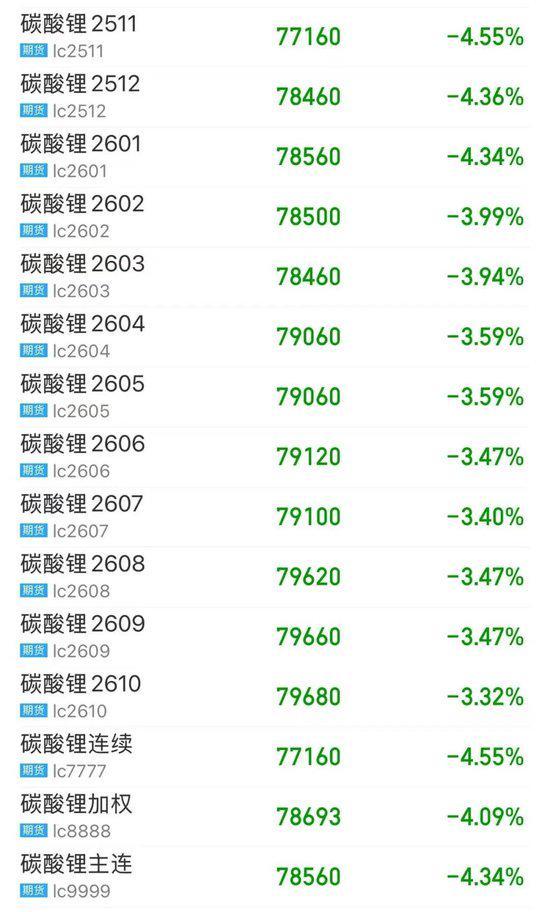 来源:市场资讯 来源:期货日报 11月4日,碳酸锂期货价格大幅回落,主力2601合约收盘下跌4.34%,报78560元/吨。