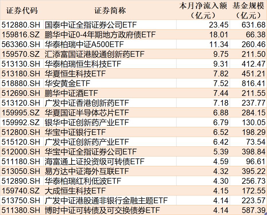 与此同时,华泰柏瑞沪深300ETF基金份额减少6.62亿份,净流出额为31.43亿元;华夏上证50ETF基金份额减少5.94亿份,净流出额为18.78亿元;南方中证500ETF基金份额减少1.88亿份,净流出额为13.78亿元。 截至11月4日,本月资金净流入额居前20的ETF名单如下: