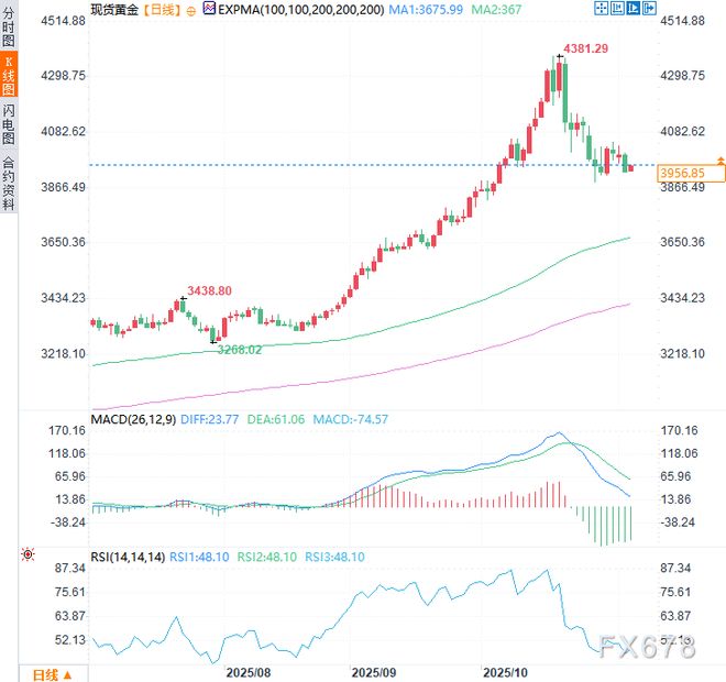 不过,金价的上涨空间可能受限。随着市场对美联储今年进一步降息的预期减弱,交易商在美元走强的背景下选择获利了结,这给黄金带来压力。美元走强使得以其他货币购买的投资者需支付更高成本,从而抑制全球需求,对无息资产黄金形成压制。 交易商正密切关注周三晚些时候公布的美国10月私营部门就业数据,以寻求美联储货币政策前景的更多线索。ADP非农就业人数变动预计将显示新增2.5万个岗位,而前值为减少3.2万个。同日,美国供应管理协会(ISM)也将公布服务业采购经理人指数(PMI)报告。 黄金在美国联邦政府长期停摆中回升 美联储于10月会议上将基准利率下调至3.75%-4.0%的区间,但美联储主席杰罗姆·鲍威尔表示,今年再次降息“并非既定事实”。 盛宝银行奥勒·汉森表示:“犹豫不决的美联储和强势美元是近日黄金抛售的罪魁祸首。” 根据CME美联储观察工具,市场预计美联储12月降息的可能性约为70%,低于一周前的93%。 黄金长线维持看涨基调,坚守关键均线上方 不过短期来看,鉴于14日相对强弱指数(RSI)在中线附近徘徊,不排除价格将进入进一步震荡整理阶段,这反映出黄金目前处于中性动能。 上行方面,首要阻力位关注4000美元心理关口。若持续获得上行动能,现货黄金有望重新测试10月31日高点4046.13美元。继续上破后,下一阻力位将上看10月23日高点4154.54美元。 下行方面,黄金初步支撑位于布林带下轨3835美元。若出现更多看跌K线形态,可能预示下行压力将持续,或将价格拖拽至下一支撑位——9月25日低点3722.08美元。