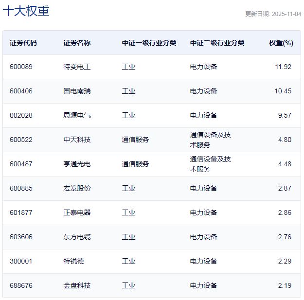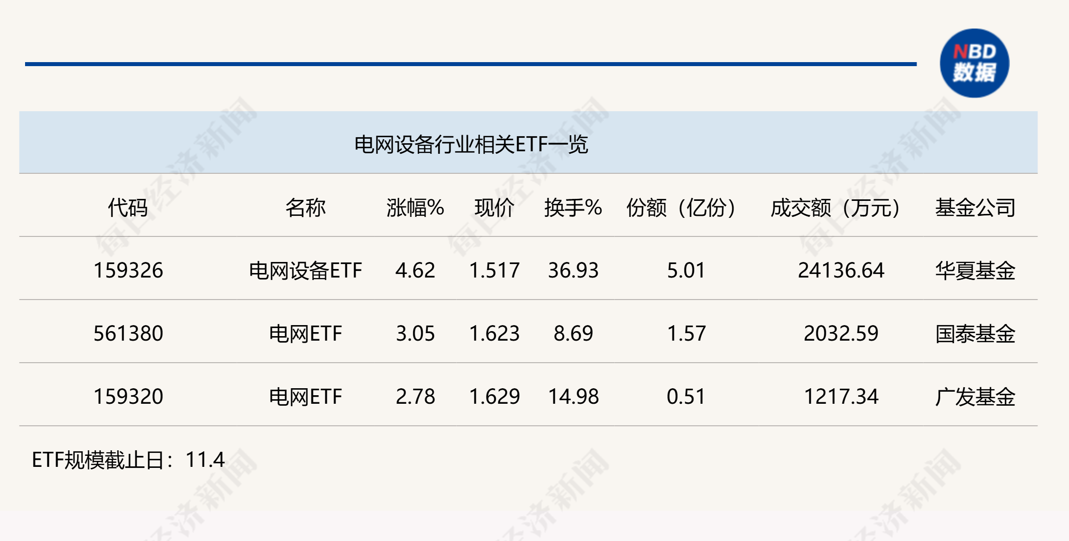 从投资逻辑来看,电力供给端的新能源渗透率不断提升,特高压工程等重要项目对电网设备的用量有望增加,国家电网及南方电网对2025年电网投资建设给出了高位续增的规模指引,电力装备行业稳增长工作方案等措施指导行业稳健发展,预计全年电网投资持续增长。 点评:电网设备ETF(159326)今日上午涨幅达到4.62%,其份额为5.01亿份,半日成交金额达到2.41亿元,其追踪的是中证电网设备主题指数。 中证电网设备主题指数选取80只业务涉及特高压产业、智能电网建设等领域的上市公司证券作为指数样本,反映电网设备主题上市公司证券的整体表现。
