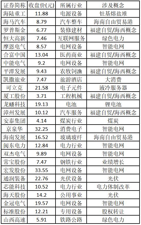 (注:创出历史新高的涨停股,说明该股人气旺盛、趋势明确,且上方无阻力,延续原上涨趋势概率较大。) 涨停板个股中,股价创出近一年新高的个股有26只(不包括创出历史新高的个股),包括海陆重工、海马汽车、罗普斯金、恒大高新、摩恩电气、合富中国、中能电气、平潭发展、凯撒旅业、可立克、厦工股份、龙蟠科技、漳州发展、安泰集团、京泉华、海南发展、闽东电力、双杰电气、常宝股份、宏发股份、通润装备、芯能科技、海天股份、金冠电气、标准股份、山西高速,具体如下表所示。